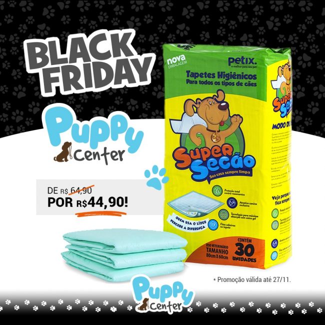 Corra pra aproveitar as super ofertas da Black Friday aqui na Puppy Center! Adquira o Tapete SuperSecão de 30 unidades por apenas R$ 44,90! Além disso, você terá descontos de até 50% em diversos produtos para o seu Pet e até 30% em Vacinas na Clínica Veterinária. Vale a pena conferir. Aguardamos sua visita! ……